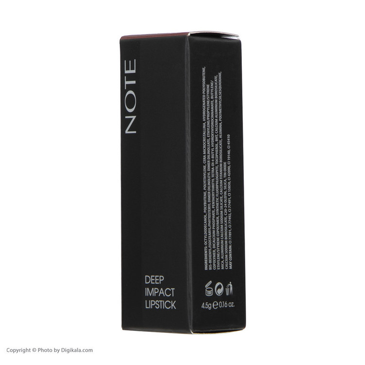 در ترکیب این محصول از ویتامین E استفاده شده است که به عنوان قویترین آنتی اکسیدانی شناخته شده به تغذیه پوست کمک کرده و آن را در برابر رادیکالهای آزاد محافظت میکند.این رژ لب دارای مقادیر بالای رنگدانه برای ایجاد رنگ با اثر بالا و حسی کرمی بر روی لبها است. این محصول به آسانی بالم لب بر روی لبها پخش میشود و درخششی مانند برق لب ایجاد میکند. ترکیبات ویژه در فرمولاسیون، پخش کامل را تضمین میکند، لطافت و انعطاف پذیری را با درخشندگی بیشتر به لبها باز میگرداند.رژ لب جامد دیپ ایمپکت نوت همچون دیگر محصولات آرایشی لب نوت فاقد پارابن است