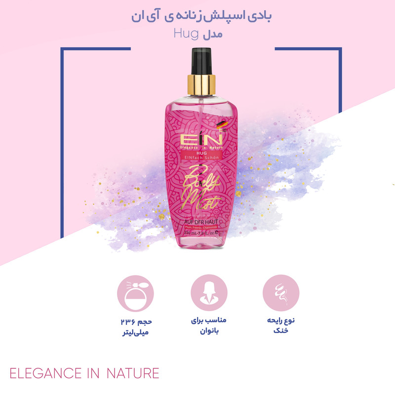 با استفاده از بادی اسپلش EIN رایحه خاص و رمزآلودی را تجربه خواهید کردید این محصول با 6 رایحه منحصر به فرد خود احساسات شما را درگیر می کند و برای همیشه در ذهنتان می ماند. بادی اسپلش نوعی عطر بدن است که با حجم بیشتر و قیمت متناسب می توان برای تمام بدن استفاده کرد. این محصول علاوه بر رایحه مطبوع به منظور آبرسانی و حفظ لطافت و جوانی پوست فرموله شده و برای مصرف روزانه مناسب است.بهترین زمان مصرف، اسپری کردن آن بر روی تمام بدن پس از حمام است.