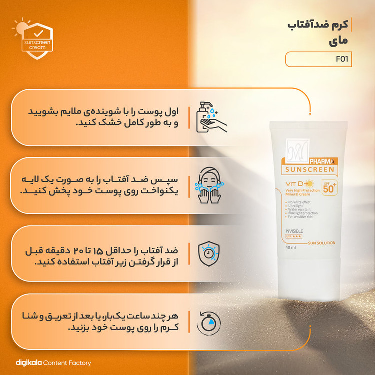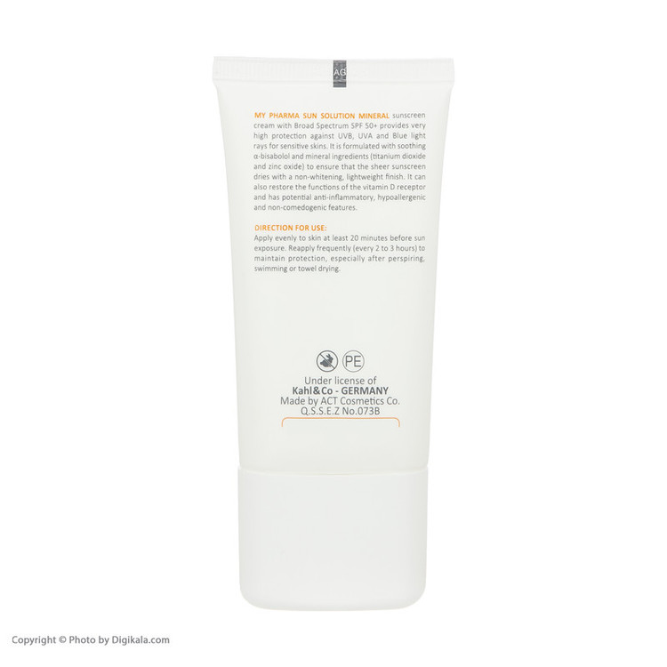 کرم ضد آفتاب SPF50 مای مدل Mineral Sun Solution یک محافظ قوی در برابر اشعه های UVA و UVB است که قابل استفاده در مجاورت تابش شدید آفتاب می باشد. این محصول بدون ایجاد اثر سفیدی روی پوست به خوبی جذب می شود و در برابر آب و رطوبت مقاوم است. این کرم ضد آفتاب برای تمامی پوست ها علی الخصوص پوست حساس مناسب است و وظیفه ی محافظت را به خوبی انجام می دهد. این کرم فاقد رنگ است و در فرمولاسیون خود دارای ویتامین D می باشد. ضد آفتاب از جمله کرم هایی است که باید برای بیرون رفتن و ماندن زیر آفتاب از آن استفاده کرد، زیرا کرم ضد آفتاب باعث می شود پوست شما از اشعه مضر آفتاب دور بماند.